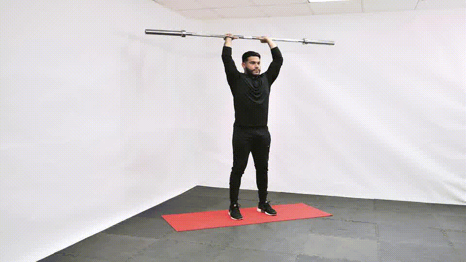• Stand tall holding a barbell overhead with both hands.