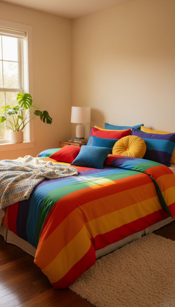The bed is the largest piece of furniture in the room, making it the perfect canvas for a bold statement. Ditch the plain white sheets for rainbow stripes or bold, multicolored patchwork quilts. To truly nail the aesthetic, look for bedding that features high-saturation primary colors—red, blue, and yellow—rather than muted pastels. A chaotic mix of pillowcases in different solid colors can also add to that playful, carefree vibe.