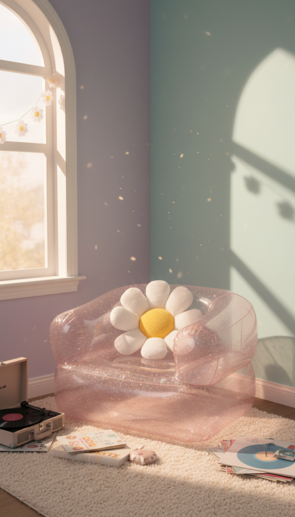 If you want to go fully retro, inflatable furniture is the ultimate flex. An inflatable blow-up chair in translucent purple or pink glitter plastic screams 90s cool. While they might not be the most ergonomic choice for hours of sitting, they serve as excellent accent chairs that reinforce the playful theme.