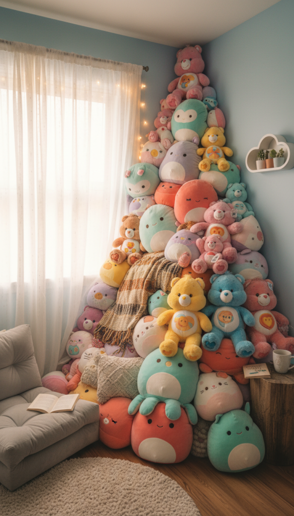 No Kidcore room is complete without an abundance of stuffed animals. Create a dedicated corner or use your bed to host a “plushie mountain.” From vintage Ty Beanie Babies and Care Bears to modern Squishmallows, the goal is maximalism. This adds texture and softness to the room while doubling as instant comfort after a long day.