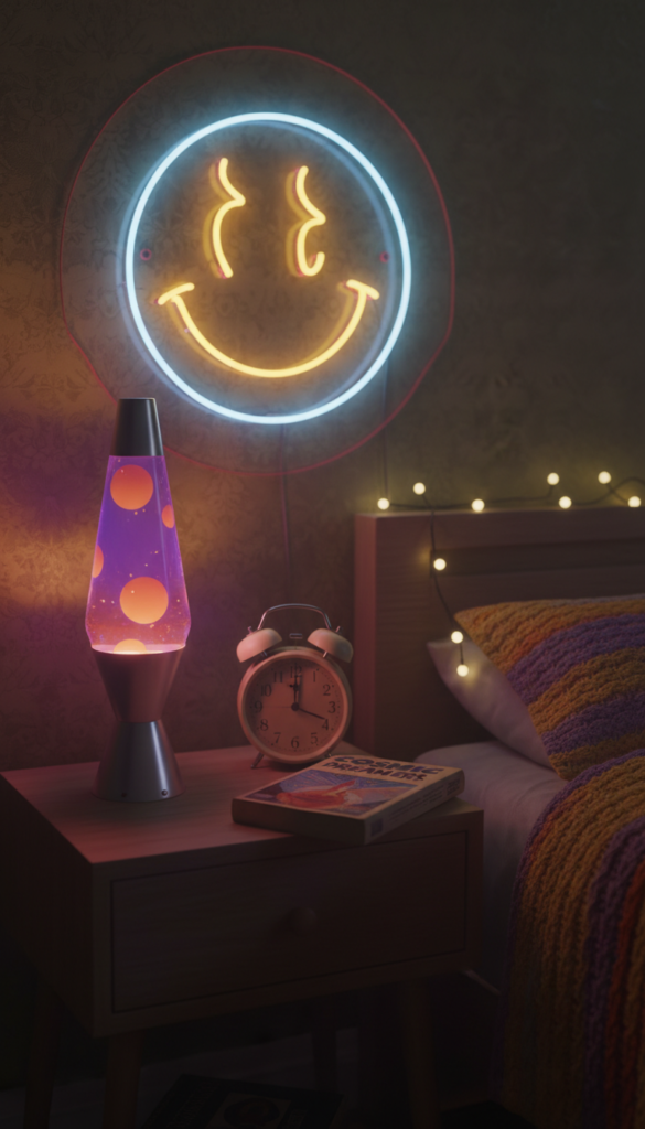 Lighting sets the mood, and in a Kidcore room, standard bulbs just won’t cut it. A classic lava lamp provides that mesmerizing, gooey glow synonymous with the early 2000s. Alternatively, look for novelty lights shaped like gummy bears, mushrooms, or flowers. Neon signs with positive phrases or smiley faces also add a modern twist to the retro theme.