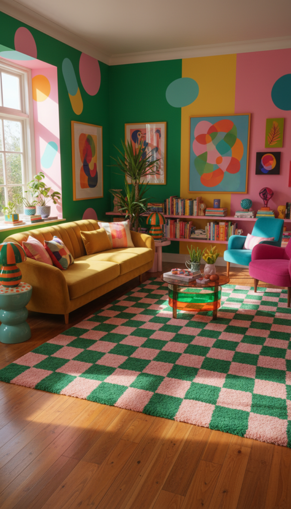 The warped checkerboard print has taken the design world by storm, and it fits perfectly here. A fluffy, tufted rug with a distorted checkerboard pattern in bright green and pink, or classic black and white, anchors the room. It adds a graphic element that breaks up the solid blocks of color from the furniture.