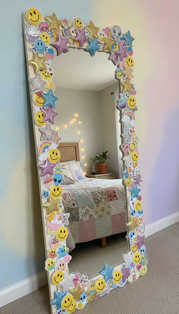 “Sticker bombing” is the art of covering a surface entirely with overlapping stickers. You can apply this technique to mirrors, laptop cases, or even the blades of a ceiling fan. Use puffy stickers, glittery stars, and googly eyes to transform mundane objects into personalized artifacts of joy.