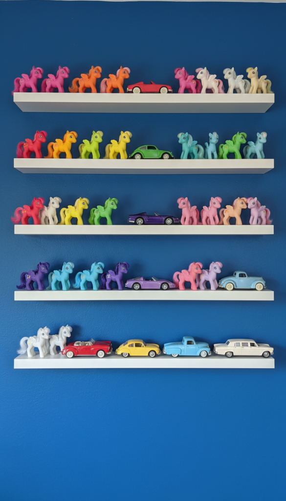 Kidcore celebrates toys rather than hiding them away. Install floating shelves specifically to display action figures, My Little Ponies, or a collection of colorful toy cars. Organizing them by color (ROYGBIV) turns your collection into a cohesive design element rather than just clutter.
