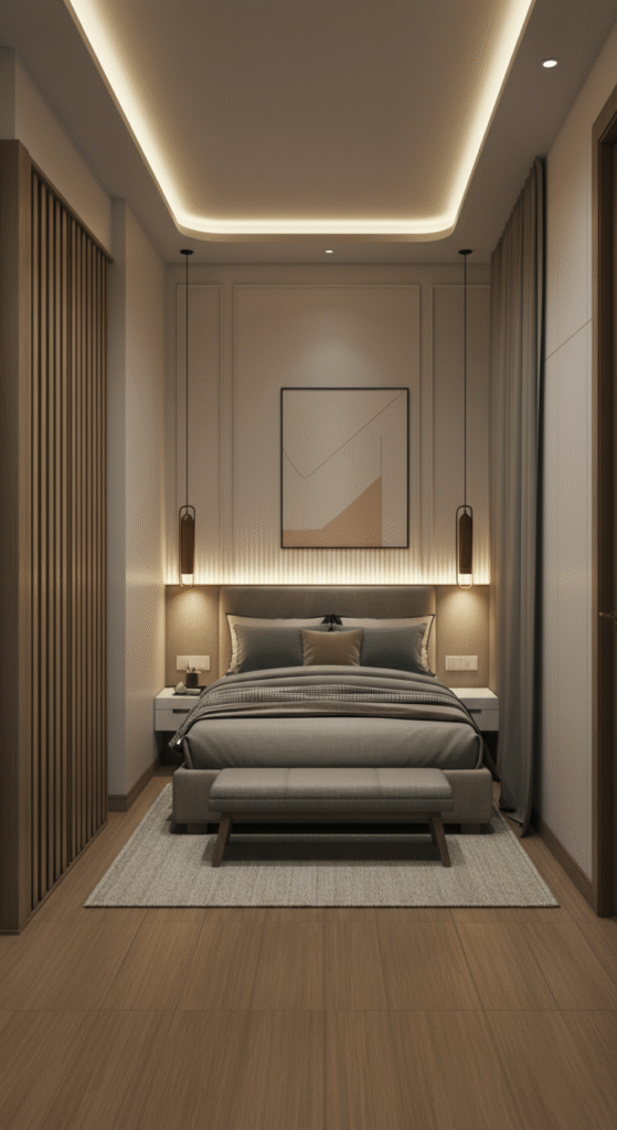 For your bedroom, use low lighting such as a simple table lamp with a light wood or ceramic base, or opt for a pendant light with a minimalist design. The goal is to create a soft, peaceful glow that doesn’t overpower the room.