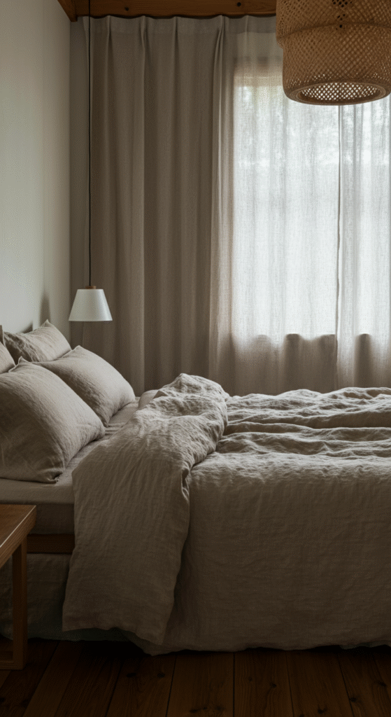 Opt for a linen duvet cover or cotton sheets in neutral tones. Linen curtains can add a soft, airy feel to your bedroom, letting natural light flow in while maintaining privacy.