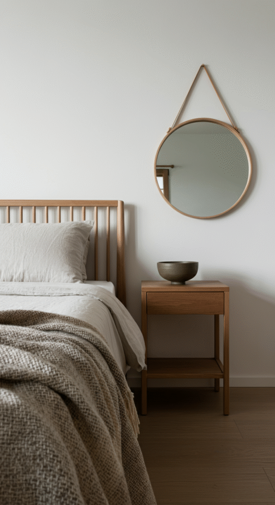 Accessories in a Japandi bedroom should be both functional and aesthetically pleasing. Think about adding a simple, elegant mirror with a wooden frame or a small ceramic vase on your nightstand.