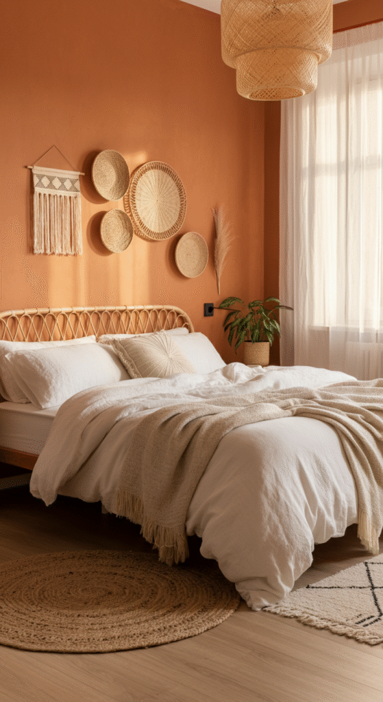 A muted clay terracotta is one of the best choices for a grounded boho bedroom. It looks warm, comforting, and a bit sun kissed. Not too bold, not too dull, just a smooth earthy tone that reminds you of slow evenings, desert landscapes, and cozy blankets.
