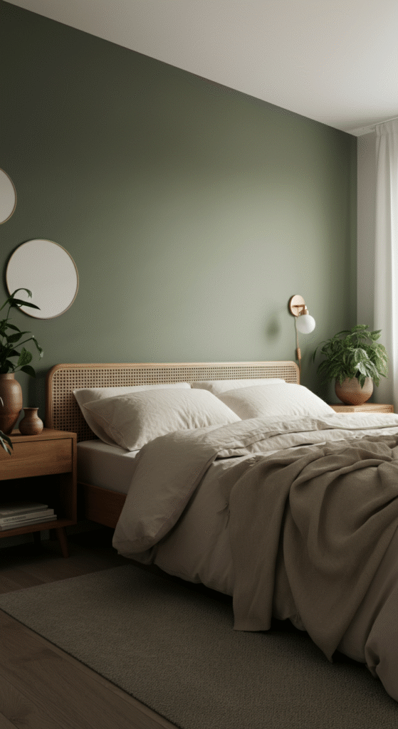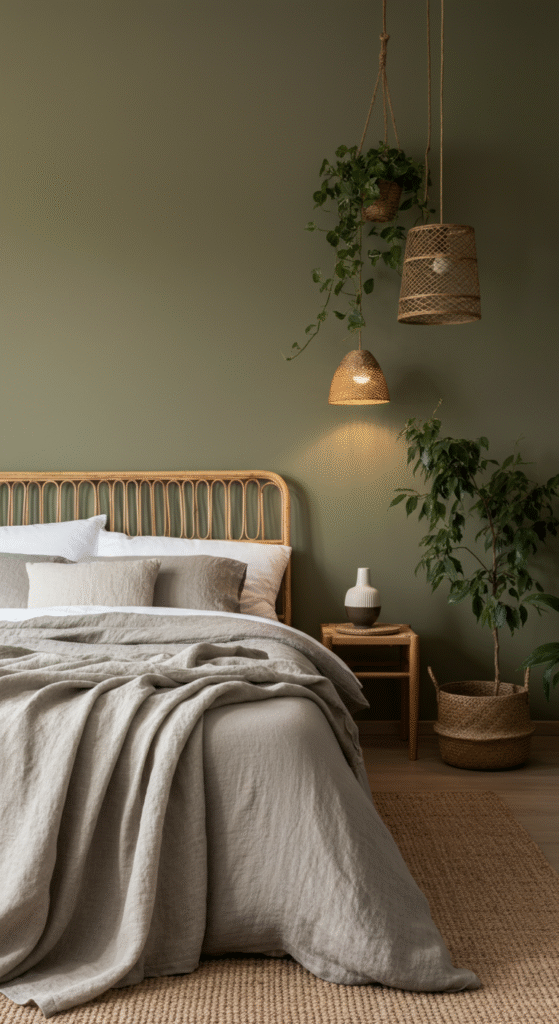 If you want your bedroom to feel like a quiet forest corner, dusty olive green is a beautiful pick. It is relaxed, organic, and instantly creates a soft earthy atmosphere.