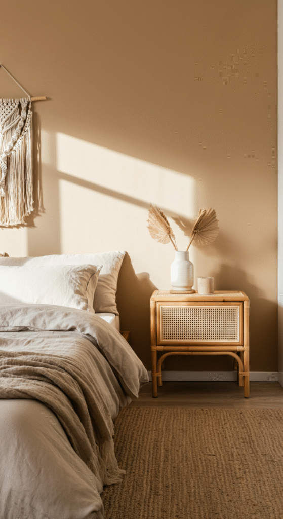 Warm beige is the ultimate calm neutral for boho bedrooms. It acts like a blank canvas that still has personality. If you love layering textures and decor, this shade helps everything come together.
