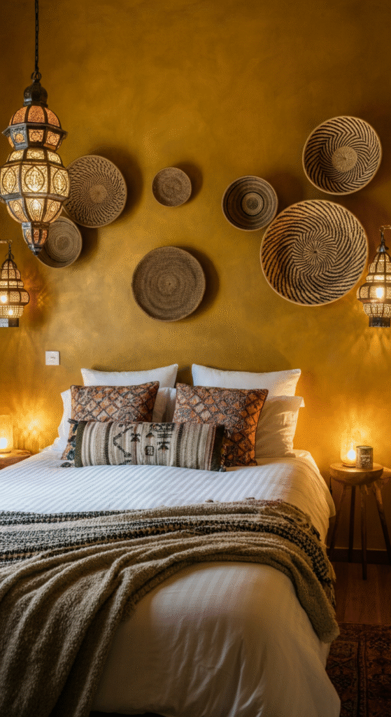It blends with handcrafted decor, desert inspired textiles, clay vases, and woven light fixtures. The room feels warm but also balanced.