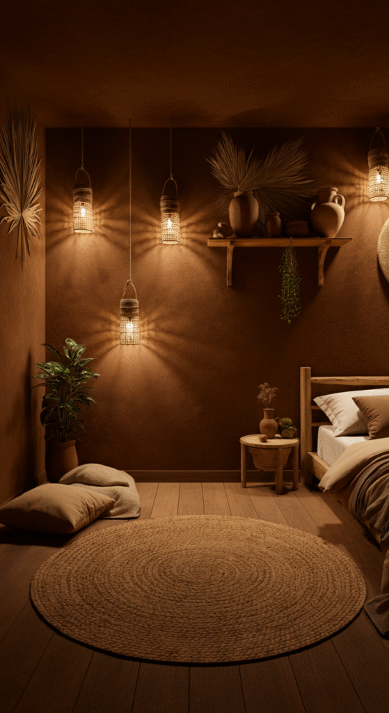 For a deeper, grounded boho vibe, cocoa brown is a peaceful choice. It brings a natural richness and stability to the room. When styled right, it feels warm, cocoon like, and very calming.
