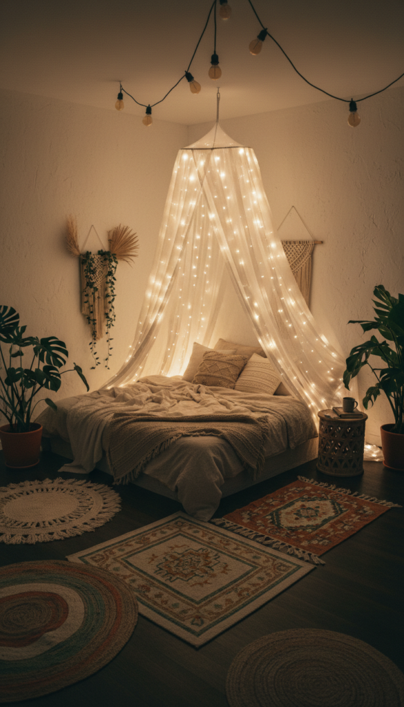 Nothing screams “boho night” quite like a cascade of twinkling lights. Draping string lights above your bed creates a starry night effect that instantly softens the room’s energy.