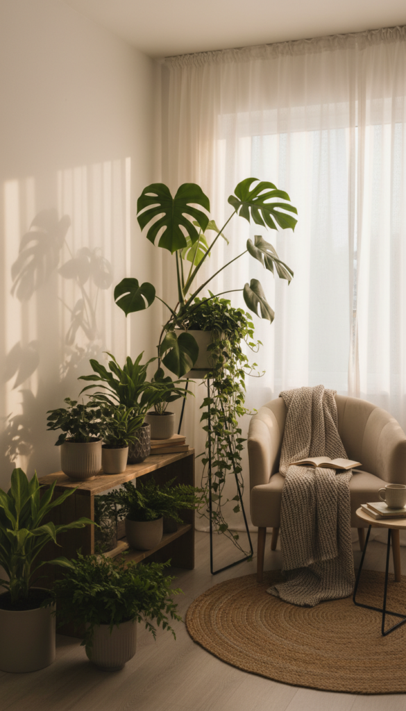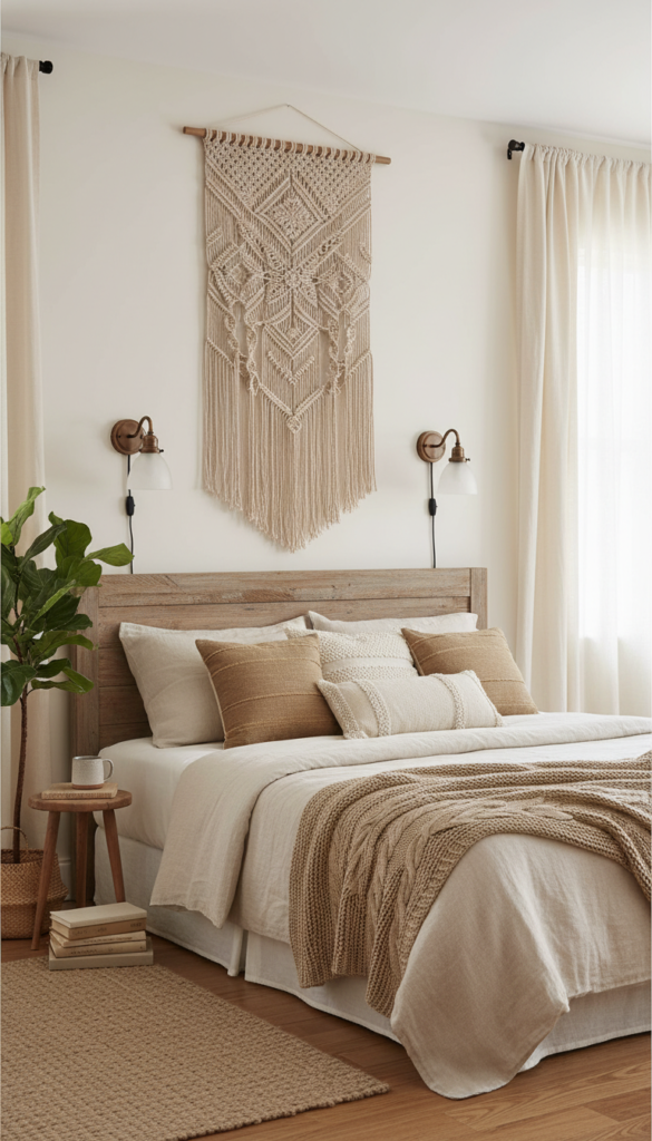 Walls need warmth too. A large macramé piece adds softness to vertical surfaces and absorbs sound, making the room feel quieter and more intimate.
