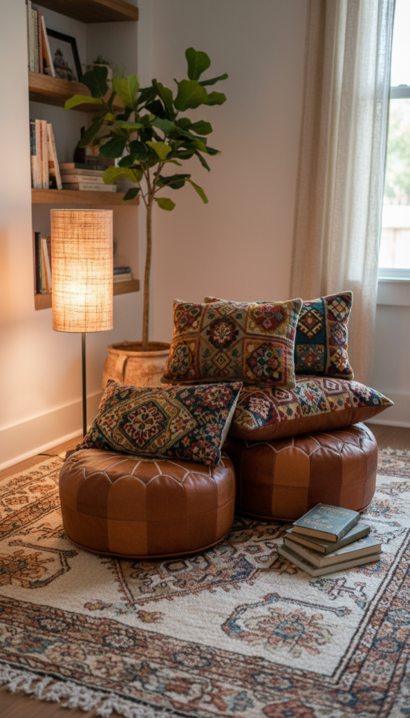 - Scatter large, embroidered poufs or floor cushions on a rug.