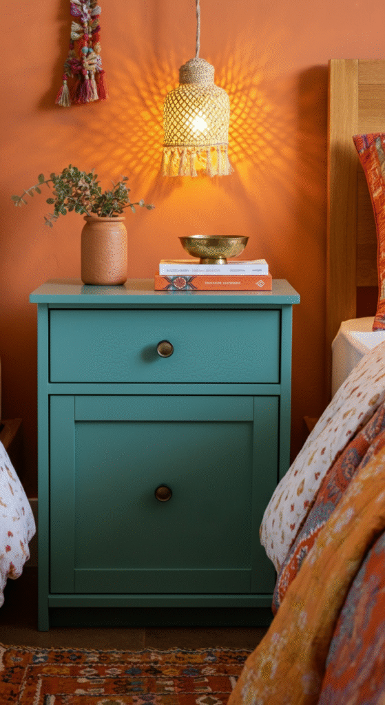 If you love more playful boho, choose a brightly painted nightstand. Something in teal, mustard, terracotta, sage, or warm coral tones works beautifully.