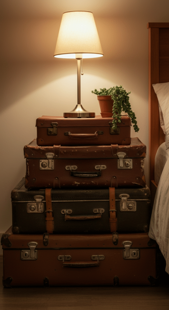 If you want a bold boho moment, stacked vintage suitcases or a small trunk work beautifully as a nightstand. It gives your room an artsy and travel-inspired feel.