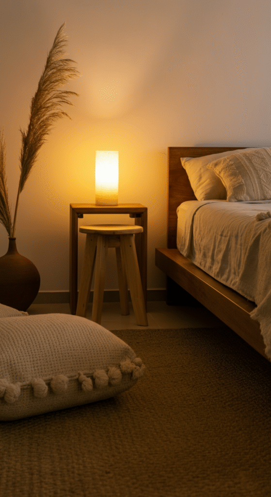 A low wooden stool, a crate placed sideways, or even a chunky floor cushion can act as a nightstand for a relaxed boho vibe.