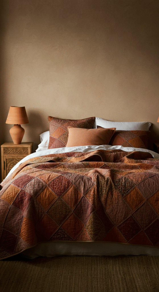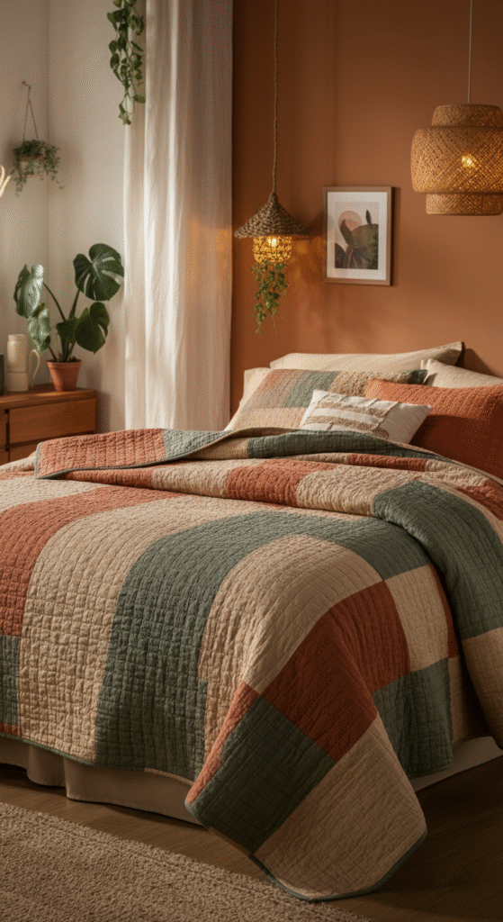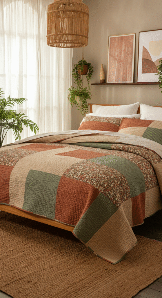 Earth tone patchwork quilts are basically the soul of boho style. They blend clay browns, sunset oranges, muted greens and soft neutrals that feel instantly grounding.