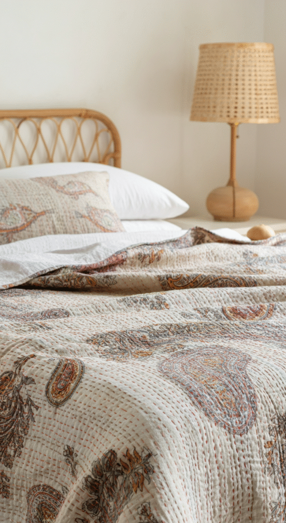 If you love quilts that look handmade and soulful, a vintage kantha quilt feels perfect. Kantha stitching started in South Asia and is famous for its straight running stitches. Every line is done by hand, so no two quilts are ever exactly the same.