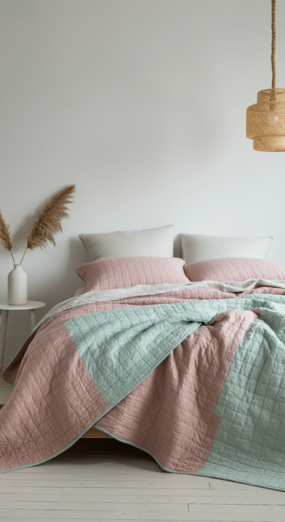 You can also layer two pastel quilts for that easy, lived in charm. The key is to keep the palette soft so the room feels airy.