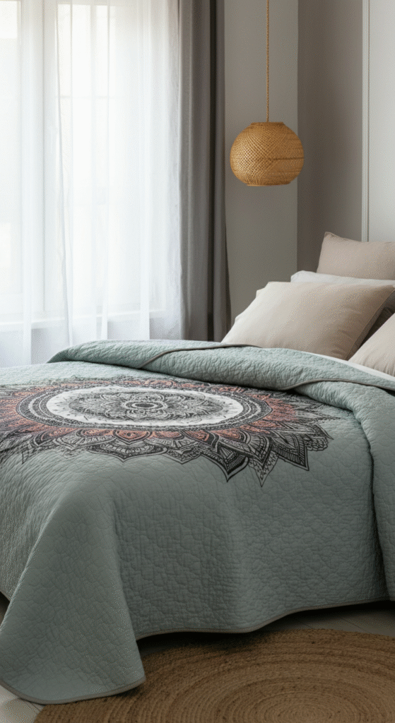 Choose muted tones if you prefer a gentle vibe or go for deep jewel colors if you want something bold and alive. Pair with simple pillows so the mandala pattern stays the hero.
