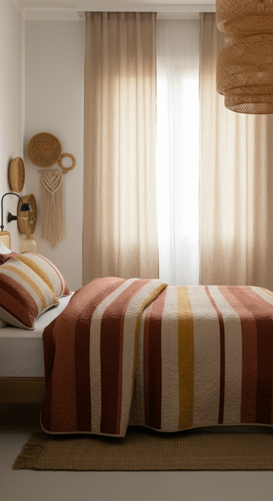 Stripes can also be boho when the colors feel earthy and the lines have that woven, imperfect charm. Boho striped quilts usually mix terracotta, mustard, olive, rust or beige tones.