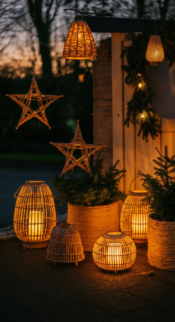Rattan, jute, bamboo and woven textures sit at the heart of boho design, and incorporating them into your Christmas yard instantly sets the vibe. Think woven lanterns, large rattan stars, bamboo hanging ornaments and jute-wrapped planters filled with winter greens.
