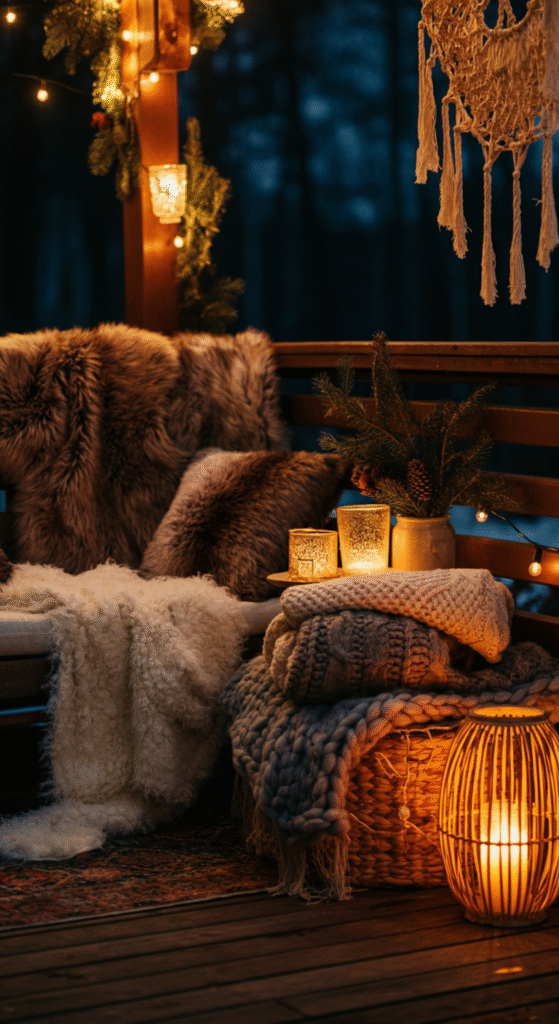 Textures play a major role in boho styling. Adding faux fur throws, chunky knit covers on seating areas, braided rugs or tassel blankets instantly gives your yard a warm winter personality.