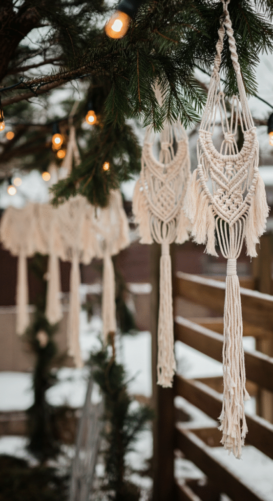 Macramé brings softness and an artisanal feel to outdoor spaces. Hanging long macramé garlands from tree branches, fence lines or porch railings adds movement and a handmade charm.