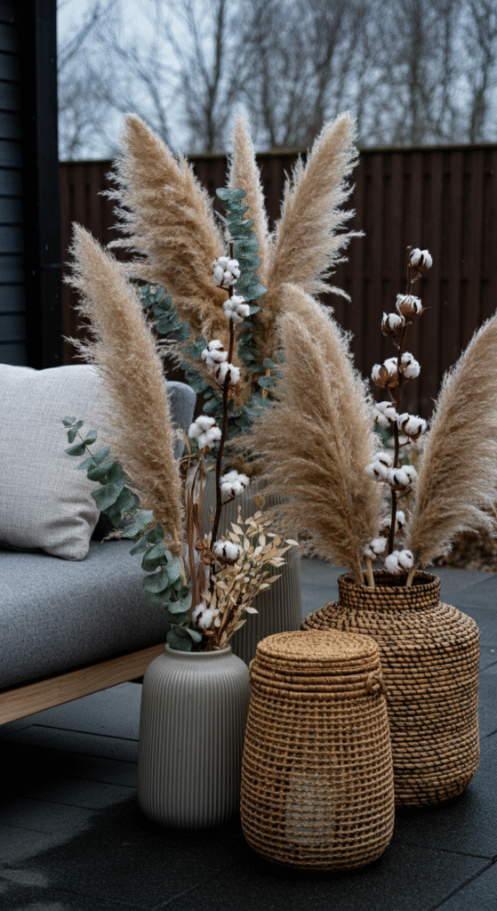 Boho style embraces dried botanicals, making them a unique alternative to fresh greenery. Pampas grass, dried eucalyptus, bunny tails, cotton stems and dried grasses can be arranged in tall planters or woven baskets to build height and softness.