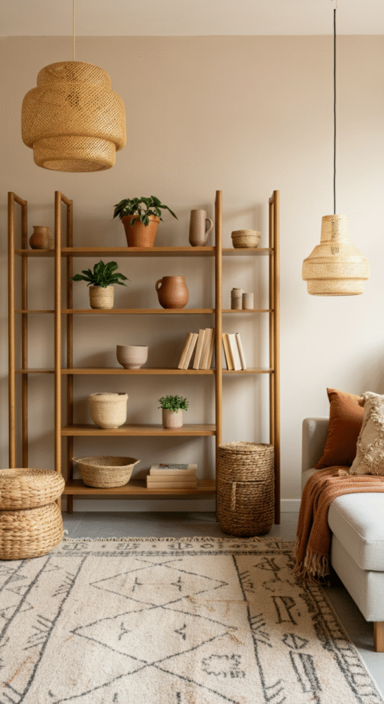 Stick to a cohesive color palette — warm neutrals, terracotta, and sage. Then repeat textures (woven, wooden, or fabric) across cushions, rugs, and separators for continuity.