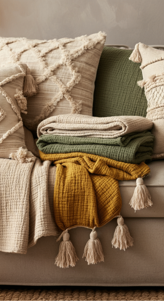 The holidays are all about comfort, so why not indulge in the cozy factor by layering throw blankets and pillows on your couch or bed? Opt for textured materials like chunky knitted blankets, woven throws, and tasseled pillows. Choose neutral or earthy tones such as beige, mustard, and olive green to maintain that bohemian warmth. For a festive twist, add some holiday-themed throws or pillow covers with subtle reindeer or snowflake designs.
