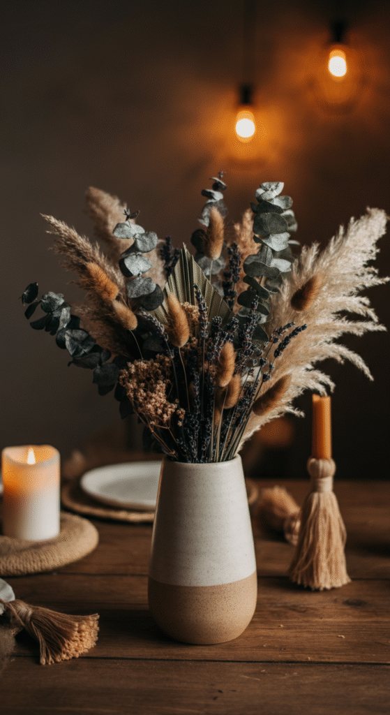 Instead of fresh flowers, consider using dried flowers and greenery for a long-lasting, eco-friendly Christmas touch. Think eucalyptus, pampas grass, or even dried lavender. These natural elements pair perfectly with boho décor and add an earthy, organic feel to your space. Place them in handmade vases or rustic jars to complete the look.