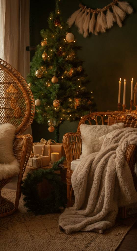 Nothing screams cozy like faux fur. Add faux fur throws, pillows, or even a faux fur tree skirt to bring texture and warmth to your boho-inspired Christmas décor. These soft accents provide a tactile experience that’s perfect for lounging around and enjoying the holiday festivities.
