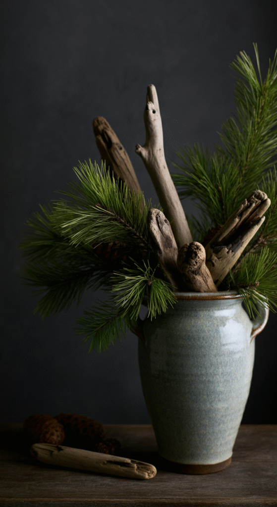 A driftwood arrangement mixed with dried pine branches gives a slightly coastal but still earthy Christmas vibe. This style works beautifully for people who want a more breezy holiday look. Driftwood has naturally soft silhouettes, and when placed in a weathered urn, it almost feels like pieces of a winter shoreline brought indoors.