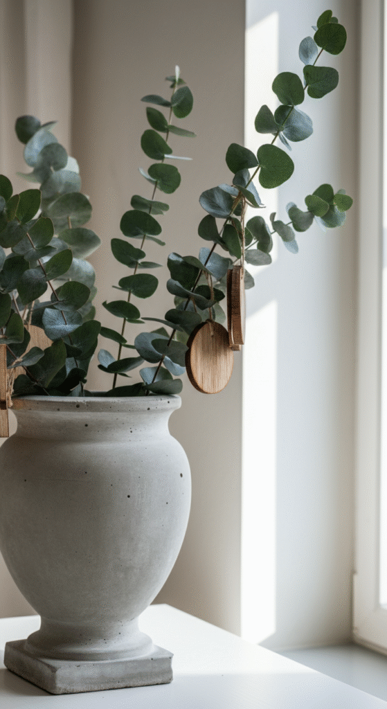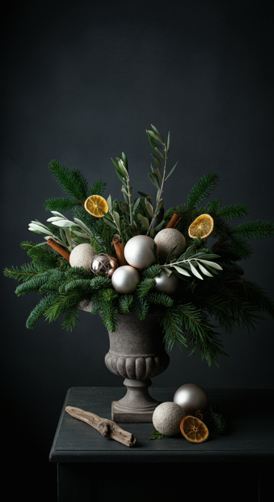 Inside the urn, go for eucalyptus, baby’s breath, dried ferns, and tall branches. You can add muted Christmas ornaments in shades like clay, beige, sage green, or soft gold.