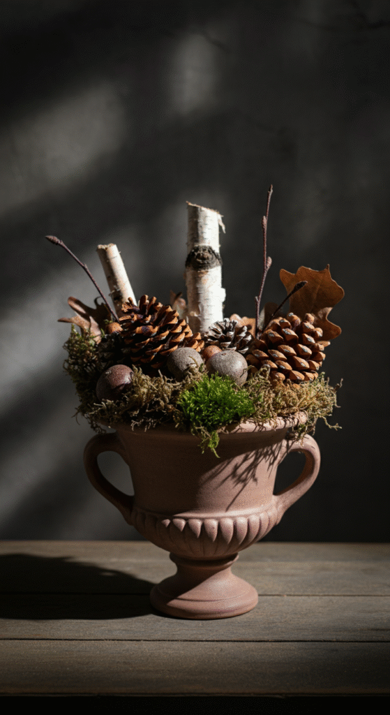 Use a matte clay urn to keep the look grounded. Layer in moss at the base, then build around it with twigs and branches of varying heights. Scatter mini pine cones throughout. If you want a slightly more finished look, brush some cones with white lime paint for a frosted effect.
