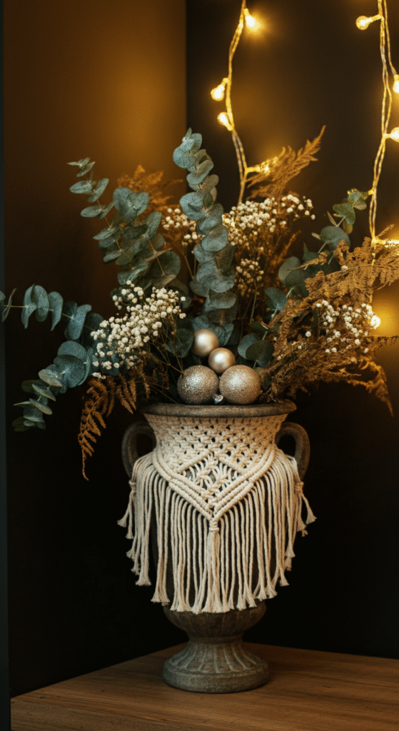 This idea brings a warm, handmade texture into your holiday space. Wrap the upper half of your urn with macrame or a loosely woven cotton rope. The natural fibers create a boho softness that pairs beautifully with winter greens.