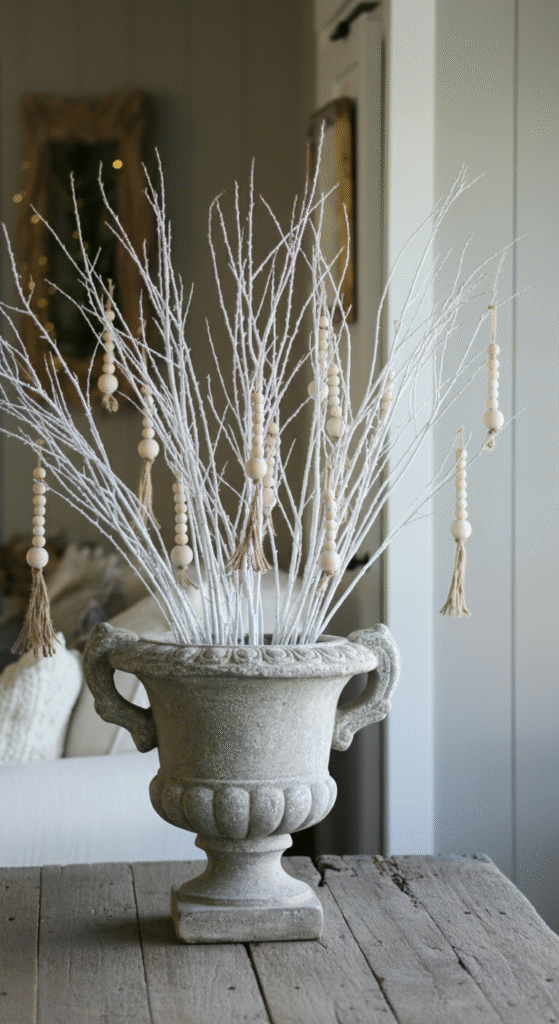A boho Christmas aesthetic often leans into imperfect finishes. White washed branches placed in a stone urn create a serene winter scene. This idea works well in entryways because the height instantly draws attention.