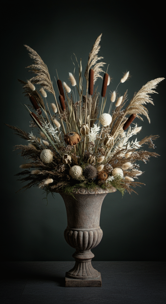 Fill the urn tightly so the arrangement looks full and cozy. You can tuck in olive branches, dried lotus pods, or small dried orange slices for a natural twist. Place the urn on a woven mat or boucle stool to enhance the boho texture.