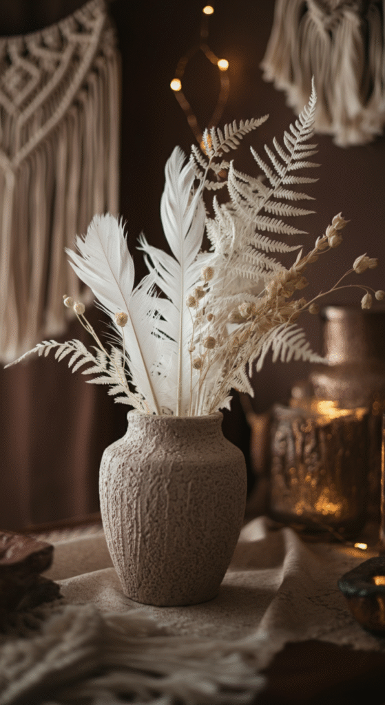 For a softer, airy look, mix long white or cream feathers with dried winter ferns. This arrangement feels almost dreamlike. Perfect for bedrooms, reading corners, or a calm holiday nook.