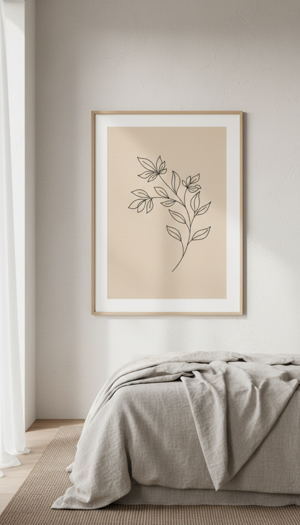 Simple, elegant, and effortlessly chic, minimalist line art focuses on the essence of the subject rather than the details. These pieces often feature single-line drawings of leaves, flowers, or female forms entwined with nature. They work perfectly in small bedrooms where you want to add character without cluttering the visual space.
