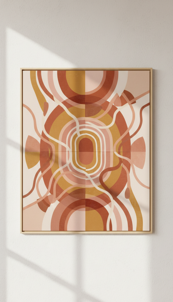 This style blends structure with fluidity. Think arches, half-circles, and uneven lines in muted tones. It is a modern take on the 70s retro vibe that often influences bohemian decor. It feels organized but not rigid, making it perfect for a relaxing bedroom.