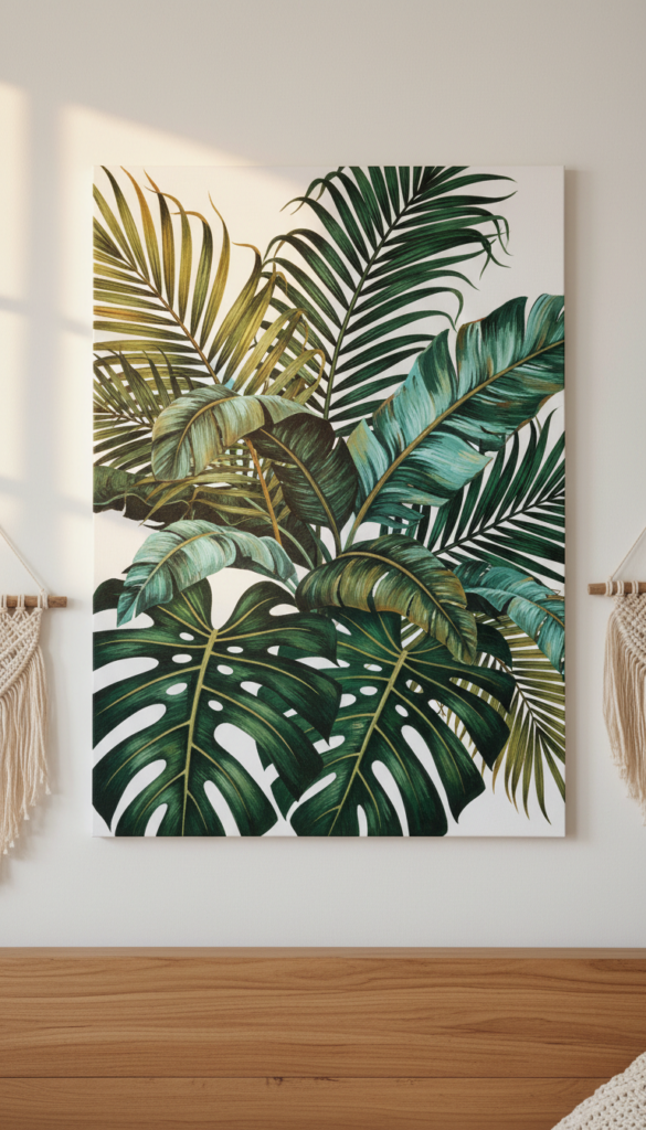 Nothing says “boho bungalow” quite like lush greenery. If you aren’t great at keeping real plants alive, an oversized painting of a Monstera leaf or a palm frond is the next best thing. This bold choice acts as a statement piece, anchoring the room and bringing an immediate sense of life and vibrancy.