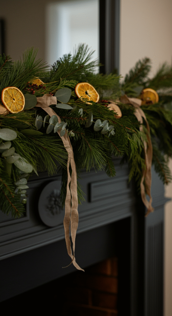 Start with a base garland, then add sprigs of eucalyptus, cedar, or pine picks in alternating directions. This prevents your décor from looking stiff. You can tuck in dried oranges, wood slices, berries, or ribbon tails for dimension.