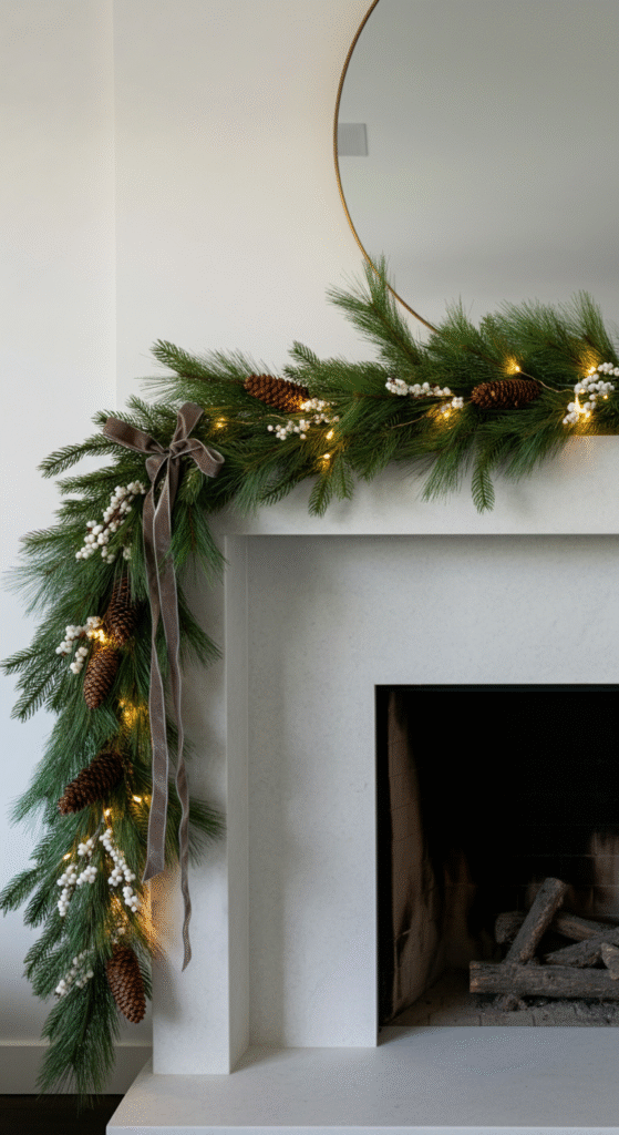 A flat garland has no depth, and that’s why most mantles look one-dimensional. Layering greenery creates soft movement and richness.
