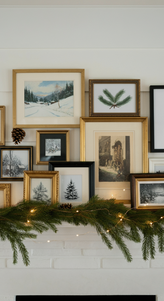 One of the most overlooked décor elements: framed artwork. A mantle with seasonal prints instantly looks editorial and intentional.