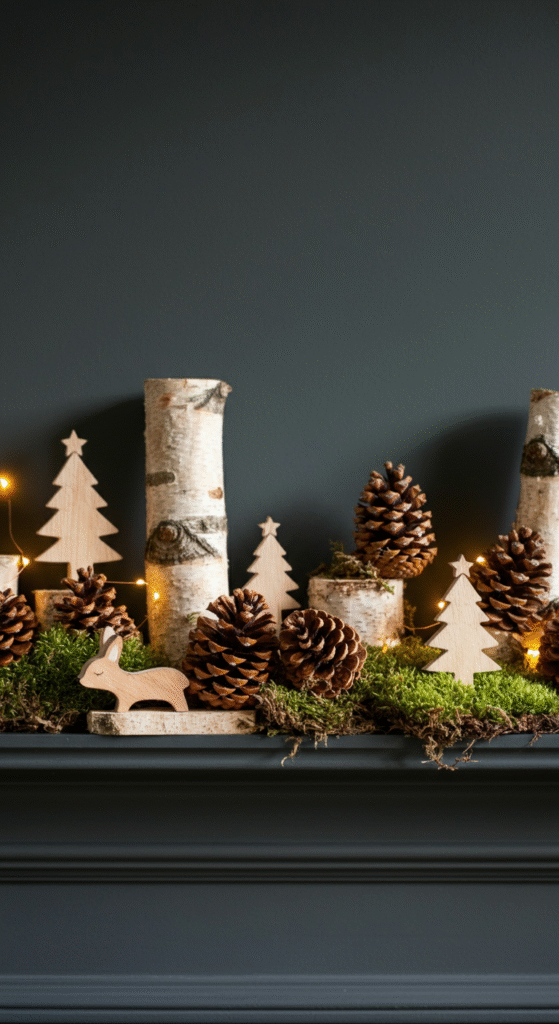 Bring the outdoors inside for a cozy, storybook feel. Think soft moss, bark textures, pinecones, wood slices, birch logs, and earthy tones.