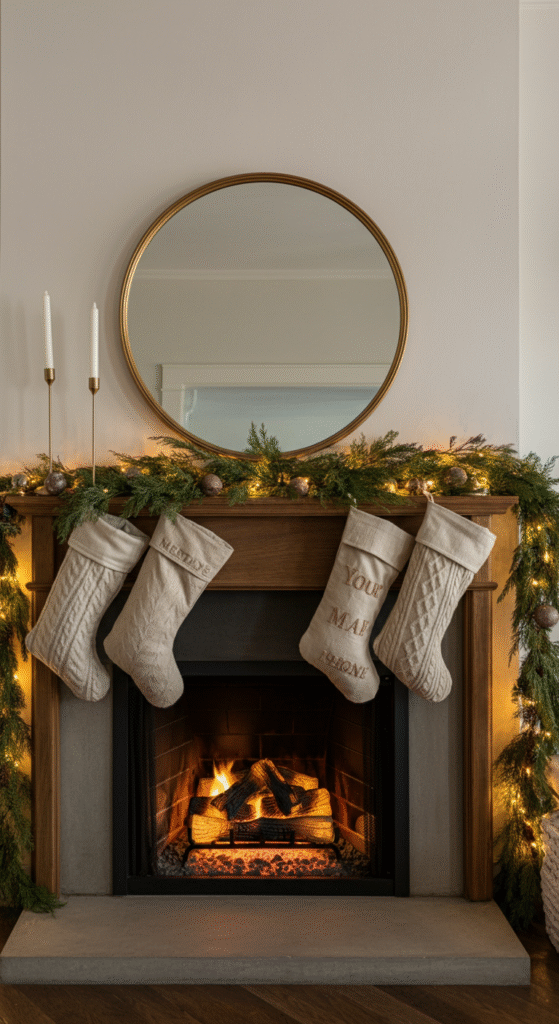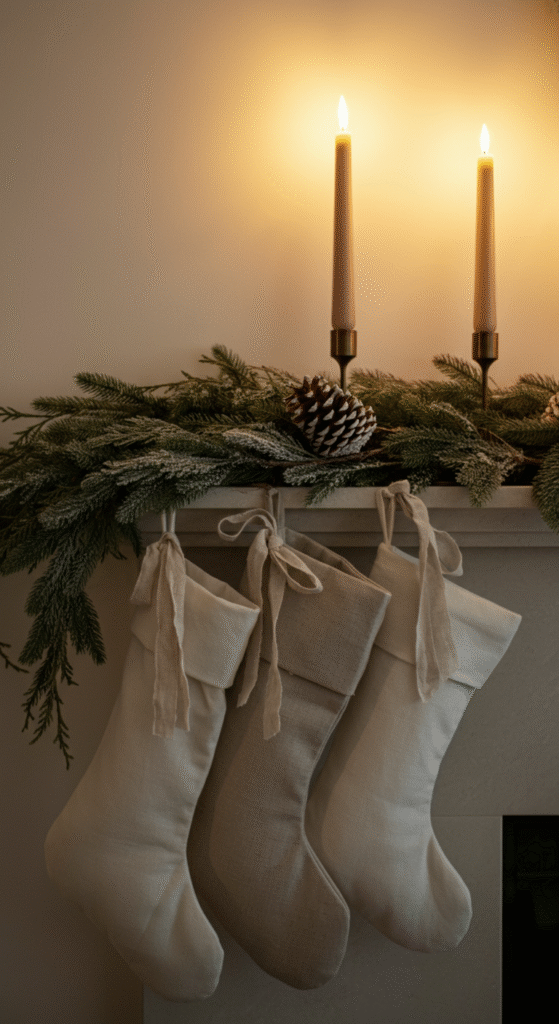 If you prefer calm, clean, and modern décor, a neutral mantle works wonders. Think white stockings, bleached pinecones, frosted greenery, linen ribbons, and soft beige candles.